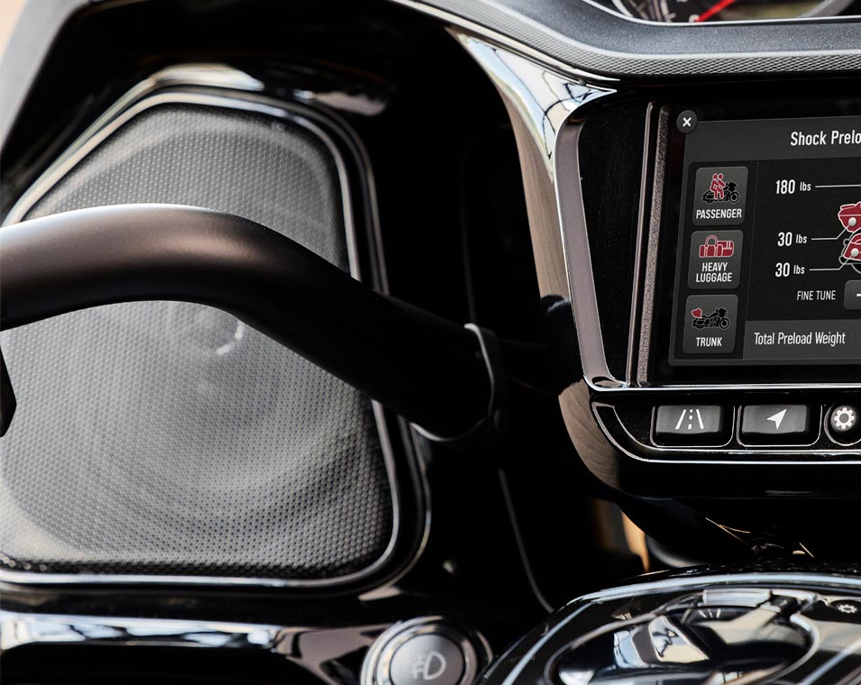 | EEquipamiento estándar | Tecnología Smart Lean; precarga de suspensión trasera ajustable electrónicamente; asiento calefactado; luces diurnas integradas en el carenado inferior; almacenaje en el carenado inferior; pantalla táctil de 7" gestionada por Ride Command con integración Apple CarPlay; modos de conducción seleccionables; desactivación cilindro trasero; control de crucero; monitorización presión neumáticos; maletas rígidas y maletero con cierre remoto; + de 136 litros de almacenaje; defensas Highway; plataformas reposapiés del pasajero ajustables; frenos Brembo; ABS; encendido sin llave; carenado anclado al bastidor; parabrisas eléctrico; entradas de flujo de aire en el carenado ajustables; puños calefactables; sistema de audio de 200W con AM/FM; Bluetooth; USB; entrada compatible con Smartphone, toma de carga de 12V |